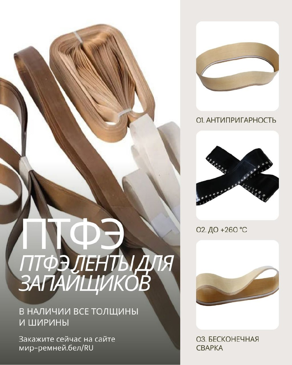 Ленты и ремни для запайщиков ПТФЭ — антипригарные элементы из тефлона, которые обеспечивают герметичную запайку пакетов в упаковочных машинах. Они выдерживают высокие температуры и постоянное трение, не прилипая к пленке и клею. Подробнее по ссылке: https://xn----jtbajindixb.xn--90ais/izdeliya-iz-teflona/teflonovyj-remen/remni-dlya-zapajshchikov