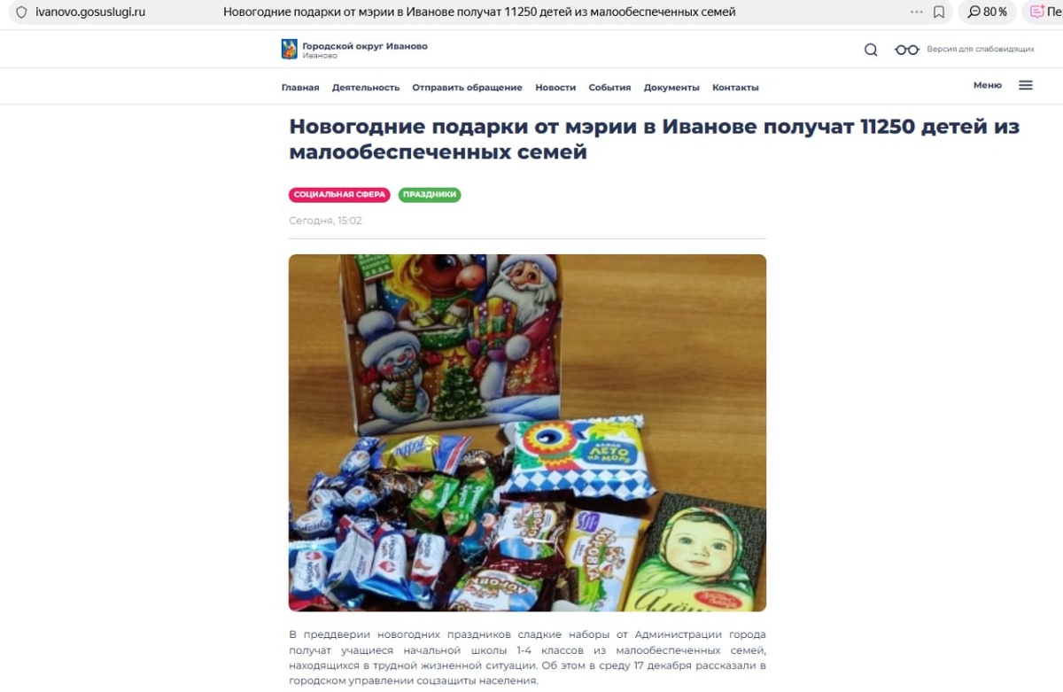 На сайте администрации г.о. Иваново размещена информация о том, что "новогодние подарки от мэрии в Иванове получат 11250 детей из малообеспеченных семей." Извините, получается, в нашем благословенном городе более 70% учащихся младших классов из малообеспеченных семей?