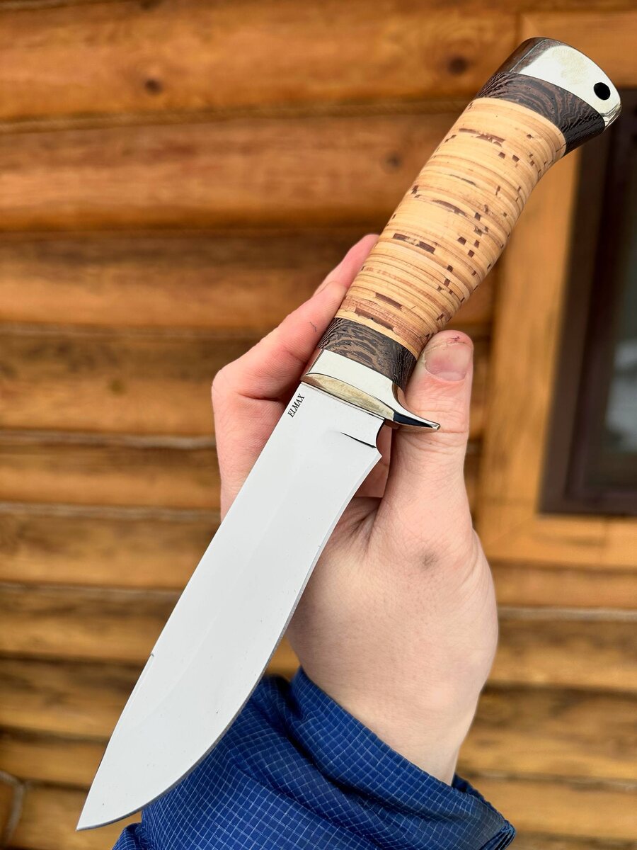 Сталь прочная на излом, долго держит заточку и не требует к себе никакого ухода. Рукоять на ноже выполнена из бересты и мельхиора. Анатомическая форма рукояти. Нож заточен в бритву. Твердость клинка (HRC): 62 Цена за нож: 14.500 рублей. В комплекте идут ножны из натуральной кожи Для заказа писать на @Nazarklinokbot или по тел +79101343831 WhatsApp/Viber