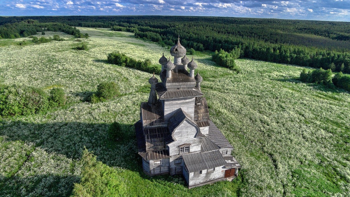 Яркий образец кубоватого многопридельного храма, характерного для этих краёв. Уникальный деревянный храм высотой более 30 метров, что сопоставимо по высоте с 10-ти этажным домом, был построен в середине XVIII века на высоком левом берегу Онеги, на Жеребцовой горе. Из храмового ансамбля до наших дней дошел только он. Владимирскую церковь закрыли в 1930 году. После этого какое-то время работал клуб, а затем ее начали использовать в качестве склада. Несмотря на это, в храме сохранилось так называемое небо — особая конструкция потолочного перекрытия с росписью. Последний раз храм ремонтировался в 1911 году и сейчас требует восстановления, которым занимаются волонтеры. По данным на 2025 год, разрушение приостановлено, но без полноценных ремонтно-реставрационных работ сохранение памятника невозможно. Где находится: Архангельская область, Онежский район, урочище Жеребцова Гора. Самое-самое! Больше на сайте.