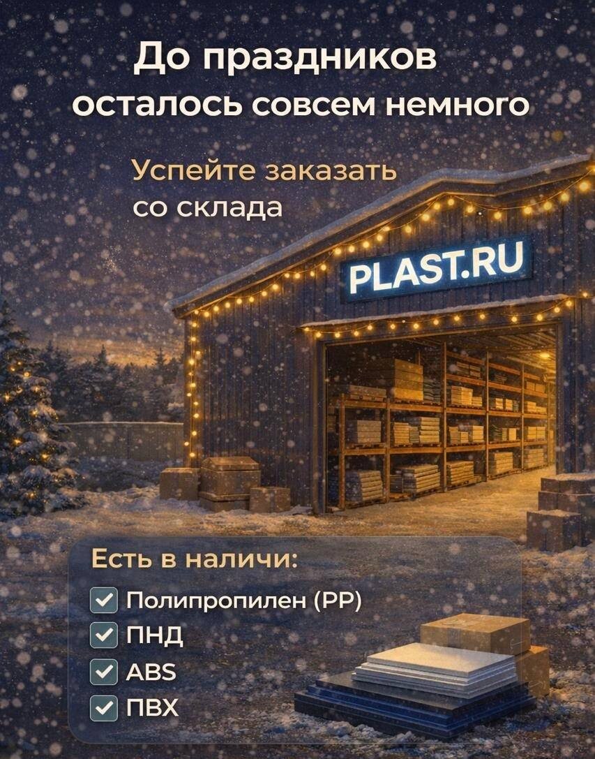 🎆 ⭐️Сейчас в наличии: ▫️ Полипропилен (PP) ▫️ ПНД ▫️ ABS ▫️ ПВХ Если проект нужно реализовать до Нового года — ещё есть возможность всё успеть. 📦 Склад работает ✂️ Резка и ЧПУ — по запросу 🤝 Поможем с подбором материала под задачу Заказать можно на нашем сайте plast.ru или по телефону +7(495)479-00-00 @plast