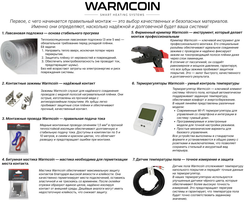 Чтобы монтаж был лёгким, а результат — профессиональным, Warmcoin предлагает весь набор оригинальных комплектующих. Они совместимы между собой на 100% и создают единую безопасную систему.