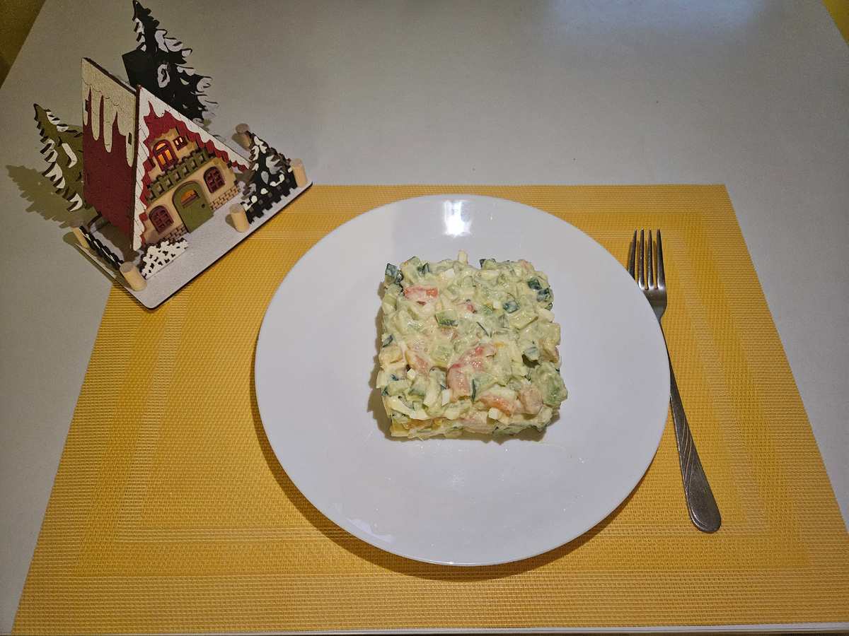 СЫТНЫЙ салат с КРЕВЕТКАМИ Увидела такой рецепт с красной рыбой, но попробовала приготовить с креветками. Для салата купила: Очищенные развесные королевские креветки Авокадо спелый (не твердый!) огурец ( хороший) 2 яйца дижонская горчица, натуральный йогурт Тeos, лимон соль Креветки заливаю кипятком, чищу хвостики, и обжаривать на правильном рафинированном (для жарки) оливком масле с чесноком. Затем режу все средне, не крупно, делаю соус:в целый йогурт я добавляю 1 с горкой ч л горчицы, немного выдавливаю лимона, можно подсолить, перемешиваю. Салат очень сытный ( для меня! ( я мало ем), ну и конечно же, полезный.