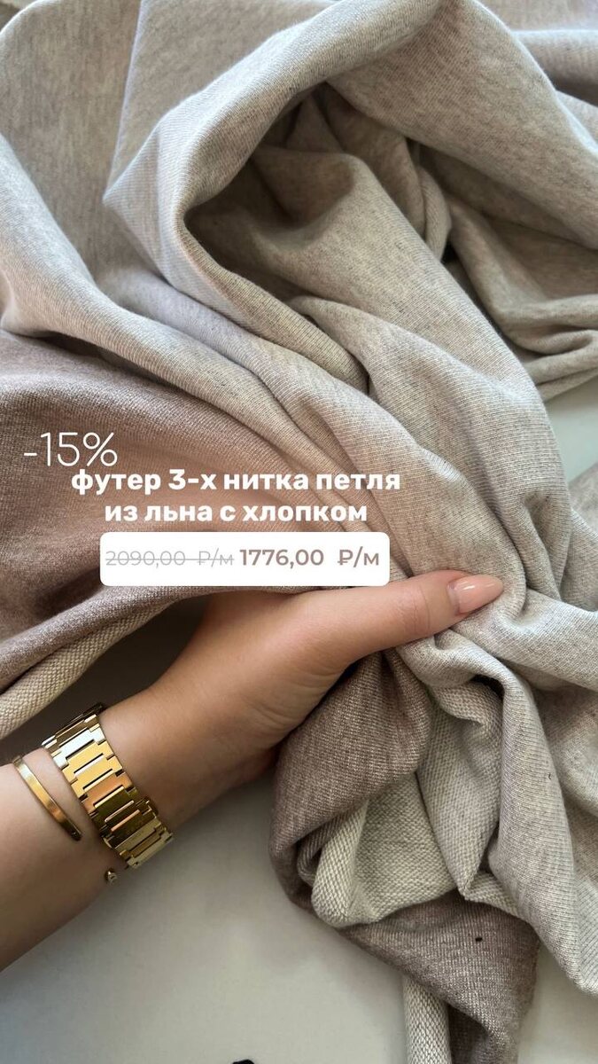 💣🔥 -15% на льняной футер 3х нитка петля😍 Представлен в 2 оттенках: • кофейный меланж • бежевый меланж Состав: 45% лён 55% хлопок Плотность: 350 гр/м2 Ширина: 190см ✨2090,00 ₽/м 1776,00 ₽/м Очень приятный на ощупь, мягкий, уютный Подойдет для пошива спортивных костюмов(брюки, худи), домашних комплектов, плотных футболок, детской одежды и др.