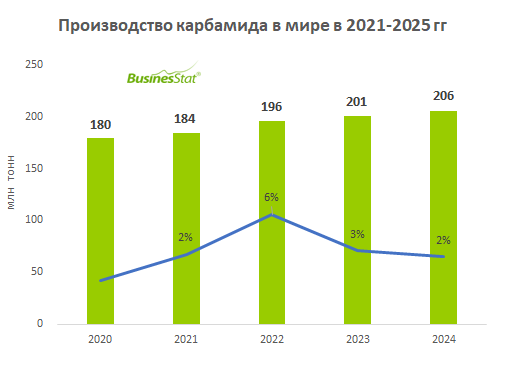 За 2021-2025 гг производство карбамида в мире выросло на 14% до 206 млн т.