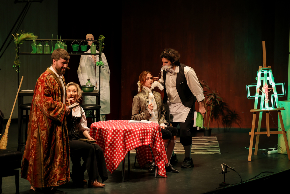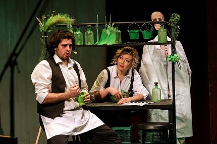 Среди этого нехитрого, с юмором подобранного реквизита в домашнем халате восточного стиля прогуливается аптекарь Семпронио, снует его юная подопечная Грильетта, за ней увивается влюбленный в нее помощник Семпронио бедняк Меньоне. Захаживает в аптеку и третий (после Семпронио и Меньоне) претендент на руку и сердце Грильетты – богатенький мажор Вольпино в солидном камзоле с кружевным жабо.