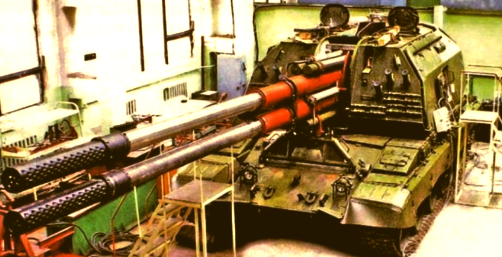 Выглядело все как фотошоп или кадр из все той же стратегии Red Alert. На гусеничном шасси стояла огромная башня, из которой торчали... две огромные гаубицы. Расположенные вертикально, одна над другой, ага, все как у двустволки вашего деда, только калибром 152 миллиметра.