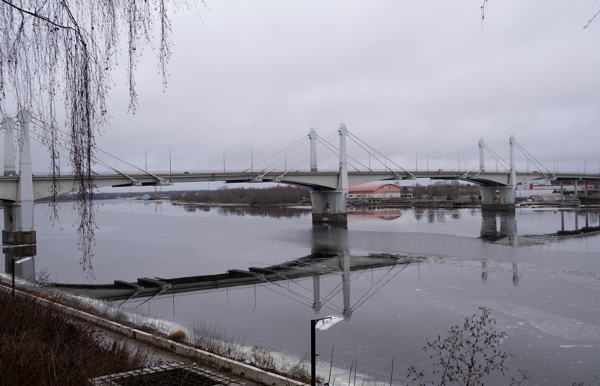Мост через Волгу в Кимрах, как в зеркале отражается в тонком слое льда