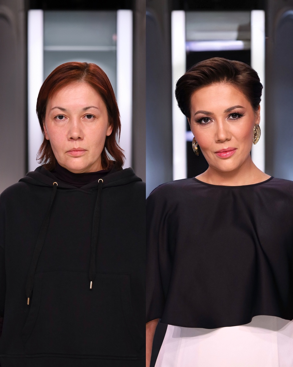 Дама слева одета банально. Да, в черном худи и простых брюках комфортно. Но эта одежда добавляет возраста и никак не выделяет из толпы. Другое дело – черная атласная накидка, надетая поверх светлого «низа». Завершающими штрихами в преображении стали стильная стрижка, качественный мейк-ап и изящные серьги.