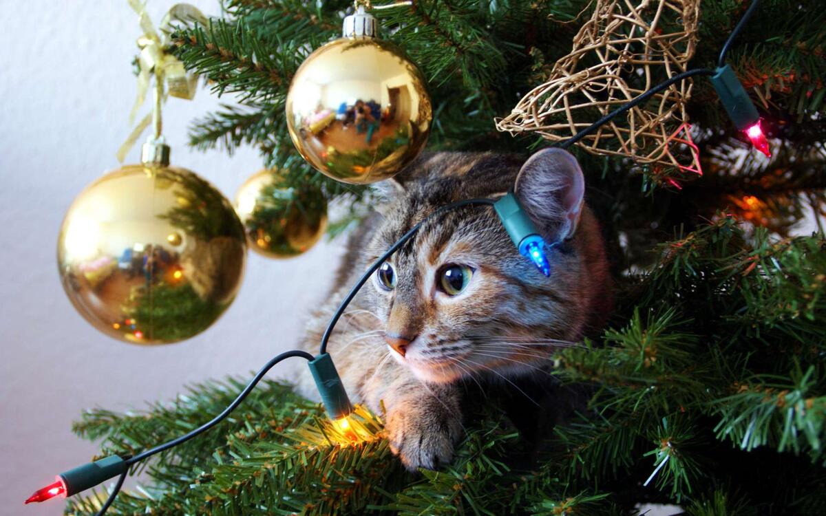 - особое внимание к гирляндам: убедитесь, что провода надежно спрятаны или закреплены. Кошки любят грызть провода, что может привести к удару током. Используйте только светодиодные (LED) гирлянды, так как они не нагреваются.
