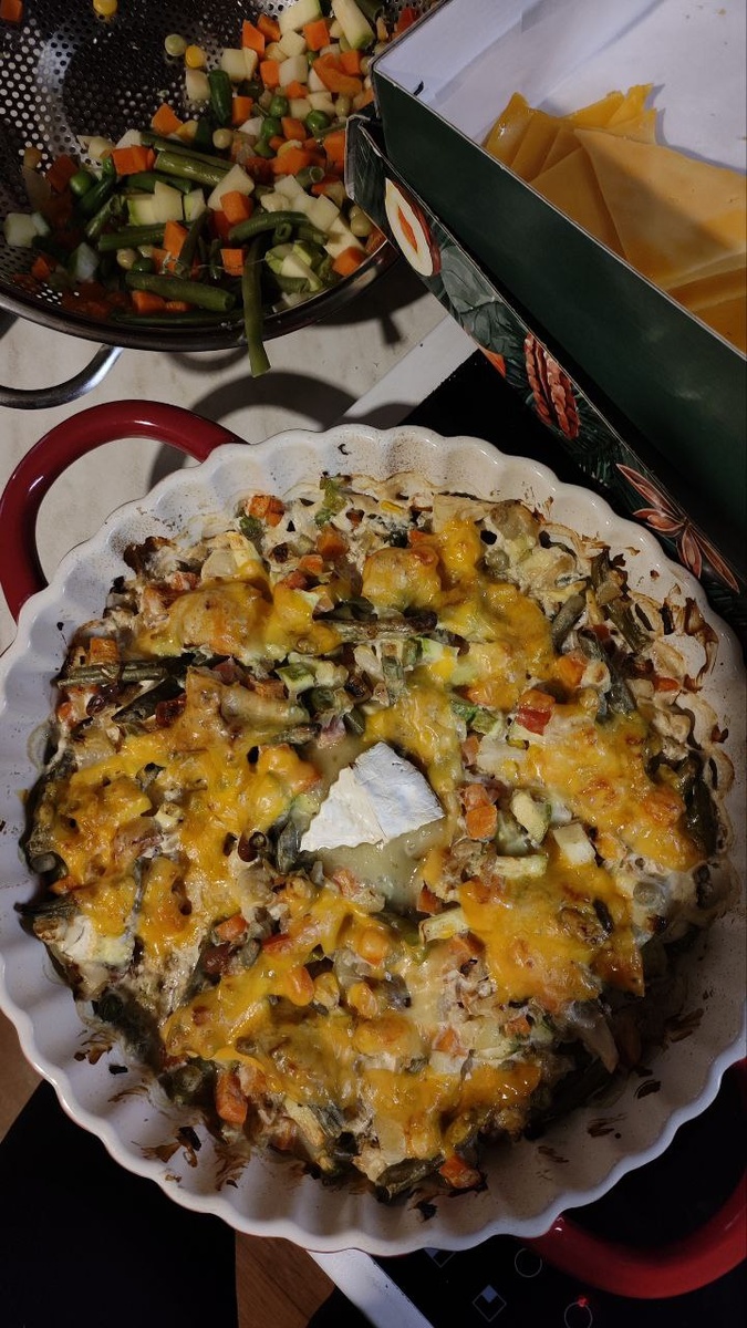 Готовая замороженная смесь, четыре ложки сметаны, приправы, соль, немного воды - и на 30 минут. Добавить кокосовое молоко, сверху сыр (чеддер, камамбер, моцареллу или другой). И ещё 10 минут. Кайф
