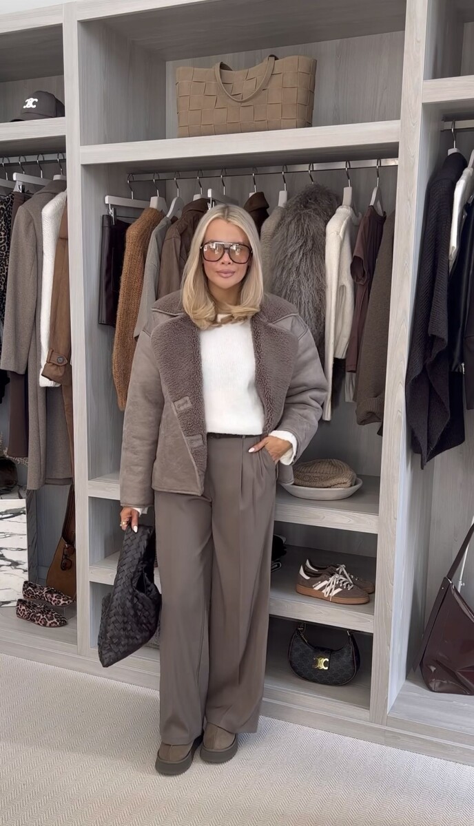 Наряды в теплой и очень привлекательной для глаз коричневой цветовой гамме обязательно оценят по достоинству дамы всех возрастов. Интересные варианты образов можно найти, например, в числе монохромных тотал-луков, хотя отдельные детали в оттенках коричневого также смогут дополнить и украсить собой многие наряды в других цветах. Помимо этого, теплая гамма идеально подходит для осеннего и зимнего гардероба, так как заметно добавляет образам визуального комфорта и уютности. 1. Прямые классические темно-коричневые брюки, укороченная теплая дубленка и ботинки на толстой подошве в тон – наряд с минималистичными линиями и кроем, выполненный в теплой и комфортной цветовой гамме. Именно в той гамме, которая хорошо подходит для осенне-зимнего гардероба модных современных дам. Оттенить основные оттенки наряда поможет дополнение базовым лонгсливом – чистого белого цвета и максимально лаконичного по дизайну фасона. 2. Укороченное пальто из тепло-коричневого искусственного меха согревает, кажется, б