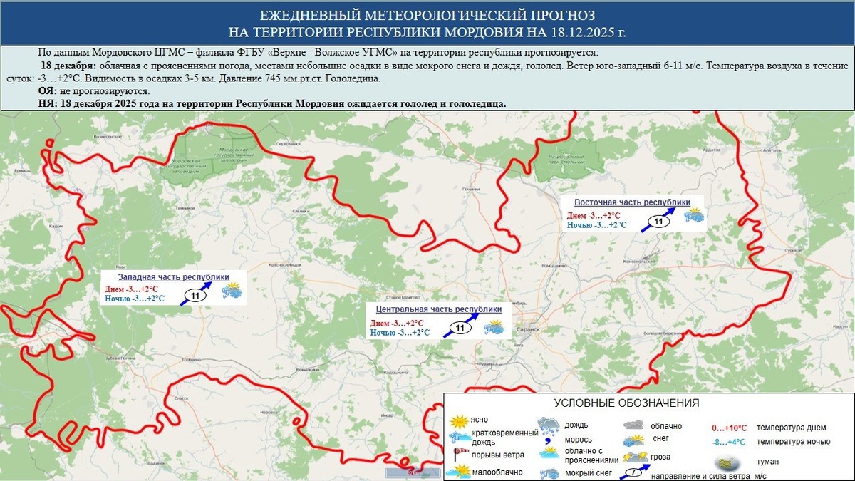 ☁️⛅⛈️ 18 декабря в Мордовии облачная с прояснениями погода, местами небольшие осадки в виде мокрого снега и дождя с видимостью 3-5 км