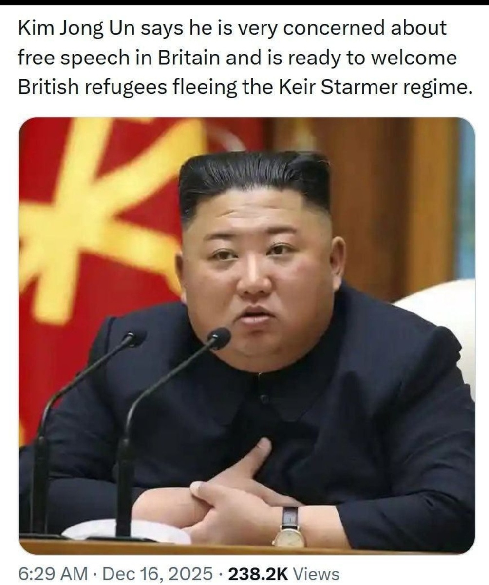 Лидер КНДР Ким Чен Ын выразил серьёзную озабоченность ситуацией со свободой слова в Великобритании и заявил о готовности принять британских беженцев, которые могут покинуть страну из-за политики правительства премьер-министра Кира Стармера.