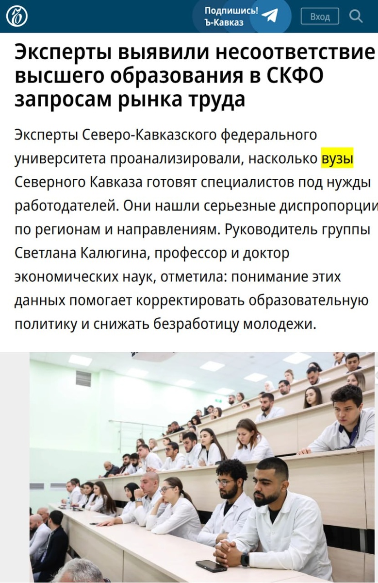 ». Согласно исследованию экспертов Северо-Кавказского федерального университета (СКФУ), в Северной Осетии наблюдается значительный дисбаланс между объёмами подготовки специалистов и реальной потребностью региона в кадрах. В Северной Осетии 6 вузов, 83% — бюджетные. Контингент вырос на 11,45%, особенно в сельском хозяйстве и инженерии. Гуманитариев выпускают 310 при нужде в 23 (в 13,5 раза больше). Медиков — 490 против 265 (на 85% переизбыток). Инженеры сбалансированы: 1100 выпускников на 1083 вакансии. Педагогов — 300 против 108.