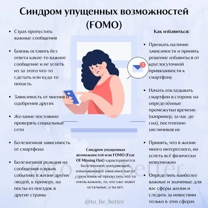 Социальная тревога. Ты боишься отключиться, выйти из чата, пропустить вечеринку, потому что это место, где «кипит жизнь». Страх оказаться на обочине.