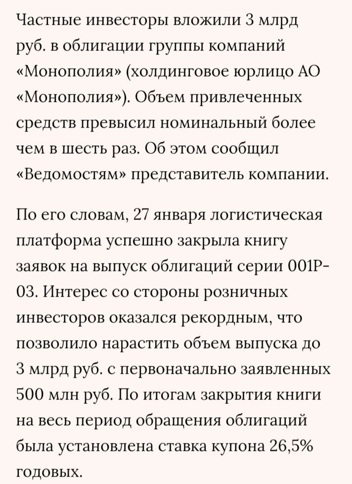 Ну а как иначе? Если вы не разбираетесь, кто-то за вас разберется. В своих интересах. На скрине новости от 28 января 2025 года, когда "Монополия" разместила третий выпуск облигаций, увеличив объем в 6 раз из-за ажиотажного спроса. Хорошо инвестбанки окучили хомячков розничных инвесторов. Множество ваших 🔥 вижу и радуюсь 🙂 📱 Александр Доржиев