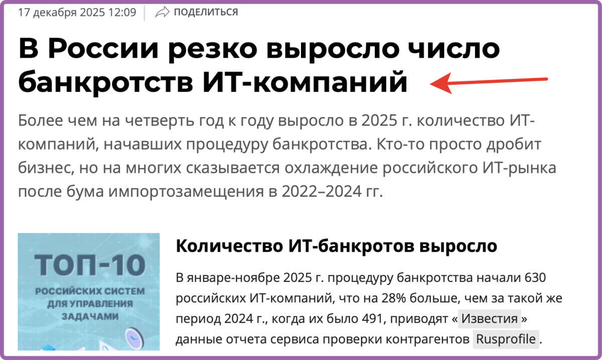 А это заразная штука :) К слову, не удивлен фактом (см. картинку). ЕСН то +7.5% с 2026 года, плюс НДС 5%. Экономика не сходится, компании проходят закрытие. Вторая причина - дробление. Русский ИТ бизнес