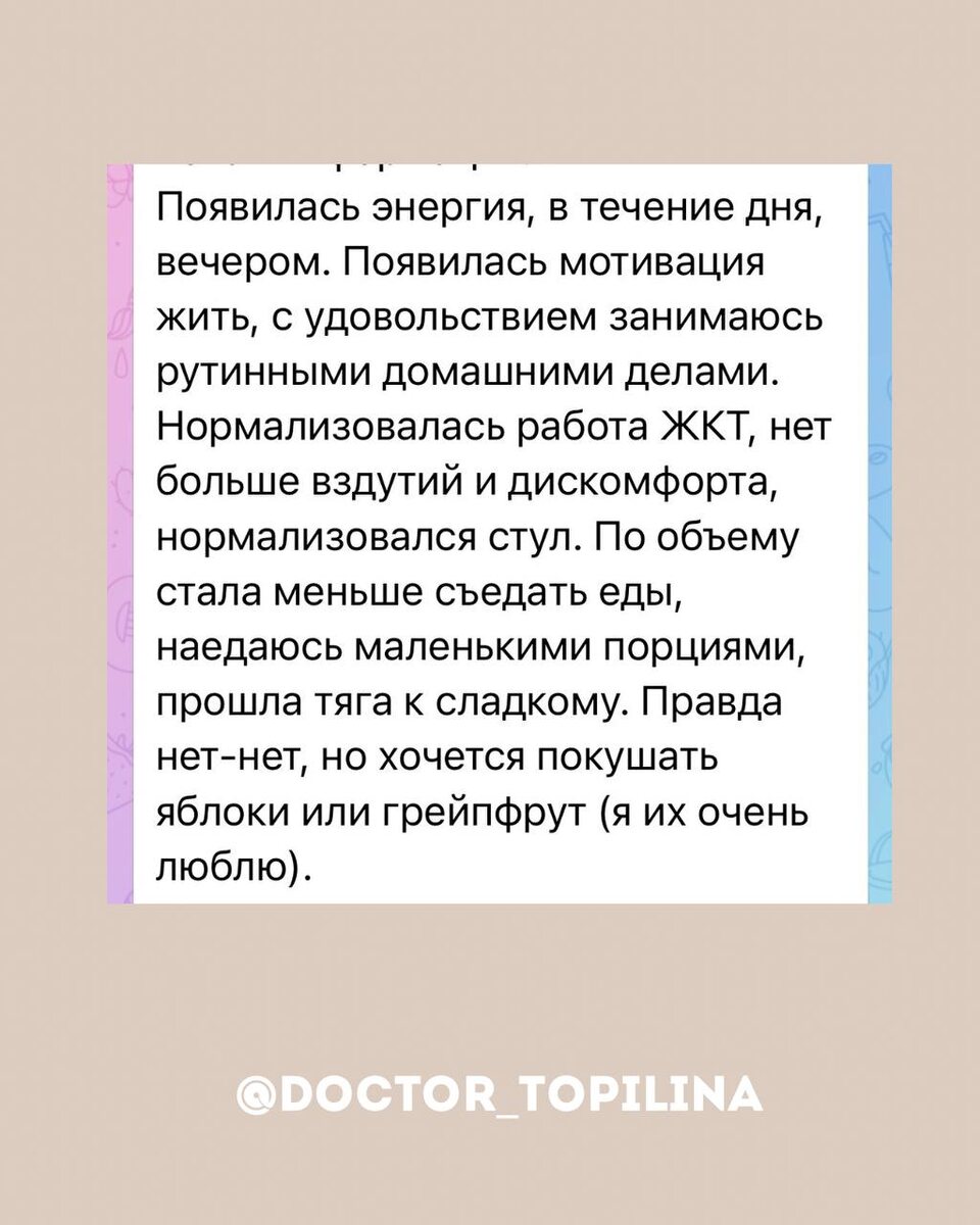 Сегодня хочу показать результаты моих девушек, женщин и мам, которые прошли мой марафон по питанию. ▫️Ни теория. ▫️Ни «правильно / неправильно». А реальные изменения женщин за 10 недель. Что произошло у участниц: — уменьшились боли в мышцах и суставах — перестал болеть живот — улучшилось общее состояние — появилось больше сил и энергии — изменилось мышление — произошла переоценка ценностей — улучшился сон — снизилась тяга к сладкому — ушли отёки И важно сказать честно: это только питание. ▫️Без глубокой работы с организмом. ▫️Без индивидуального сопровождения. ▫️Без разбора причин. На фото отзывы девушек▫️ ▫️А теперь представьте, что происходит, когда мы идём глубже. В наставничестве изменения в 3–5 раз сильнее. Потому что мы работаем не с отдельными симптомами, а со всем организмом целиком: питание, анализы, гормональный профиль, биохимия, мышление, состояние, привычки, образ жизни. ▫️Поэтапно, 3 месяца, с поддержкой. 💡 Но хочу сказать важную мысль! Книги и гайды — отличная
