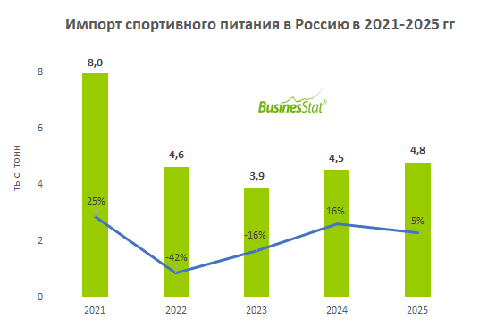 В 2024-2025 гг импорт спортивного питания в Россию увеличился на 22% относительно 2023 г и составил 4,8 тыс тонн в 2025 г.