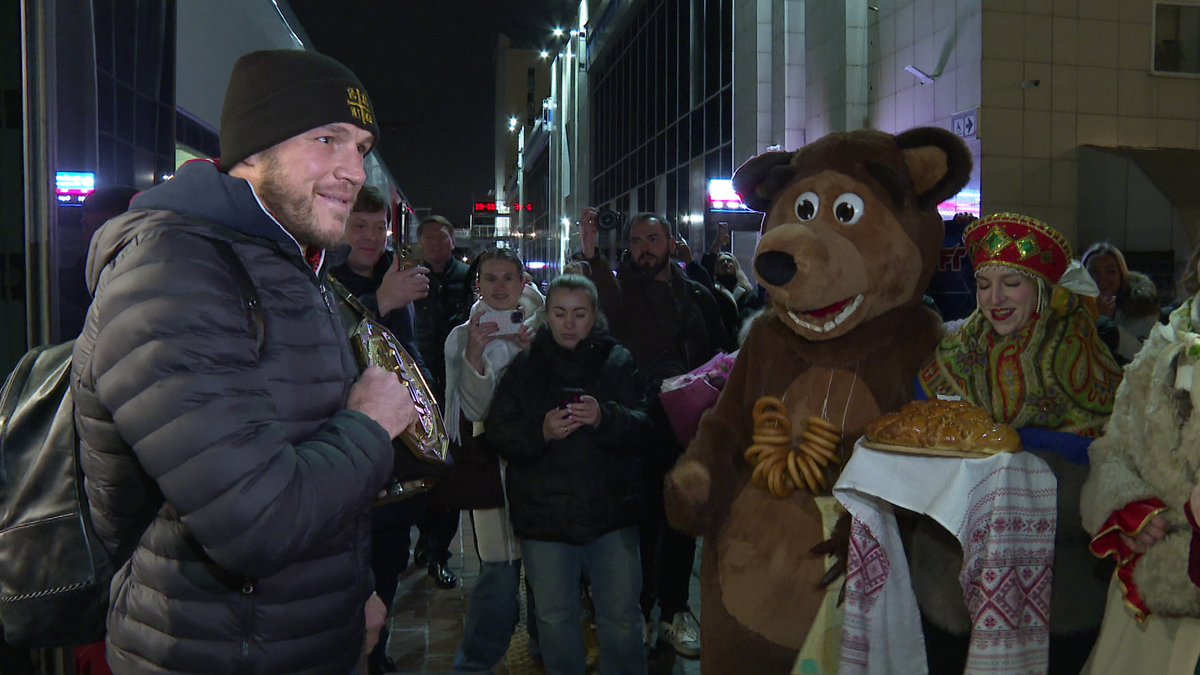 На перроне его ждали родные, друзья, поклонники и, конечно, наша съёмочная группа. Хлеб, соль, яркие костюмы и знамёна – так Белгород встретил земляка, бойца смешанных единоборств Вадима Немкова, который привёз домой титул чемпиона PFL в тяжёлом весе. Чтобы сразиться в этом бою белгородец прошёл непростой путь. Перед этим Вадим провёл впечатляющую серию без поражений – 14 поединков. Внушительную подготовку почувствовал на себе бразилец Ренан Феррейра. Поединок длился всего раунд. Противник по всем параметрам был больше нашего бойца. Но это не стало проблемой. Главное – тактика. «Соперник ударник и поэтому так как я базовый самбист, боевое самбо. Я могу и боксировать, и бороться. Но с базовым кикбоксером, у которого рост 2,03, большой размах рук, долго боксировать не стали, решили его перевести», – поделился чемпион PFL в тяжёлом весе Вадим Немков. И перевели его прямо на канвас. После борьбы Вадим Немков выполнил удушающий приём – ручной треугольник. «Очень рад вернуться домой. С по