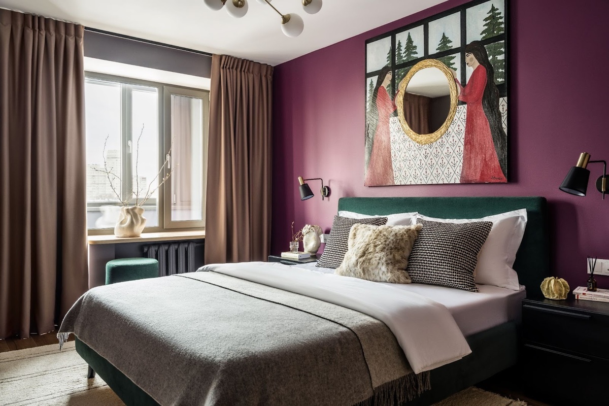 Глубокие оттенки изумруда и бордо в квартире с низкими потолками. Масса открытого хранения. Яркие выкрасы, колор-блоки и эклектика. Как «подружили» эти дизайн-приемы в обычной «брежневке» — увидим прямо сейчас. Заказчица обратилась к нам с просьбой спроектировать квартиру, в которой будет жить она сама вместе с пушистым котиком. Стилистически и эстетически ей близок минимализм, а в процессе беседы мы выяснили, что заказчице нравятся темные насыщенные оттенки и открытые системы хранения Изначально квартира была стандартной для «брежневки»: комнаты 17 и 11 кв.м, кухня 5 кв.м, прихожая, раздельный санузел. В ходе перепланировки была убрана ненесущая перегородка между гостиной и коридором, создана ниша для хранения одежды и обуви у входа. Часть спальни (3.5 кв.м) выделили под гардеробную. Мокрые зоны и кухня остались без изменений. Мы ценим работу со старым фондом, сохраняя исторические детали в современных интерьерах, — отмечают дизайнеры. — В этом проекте отреставрированы чугунные батаре