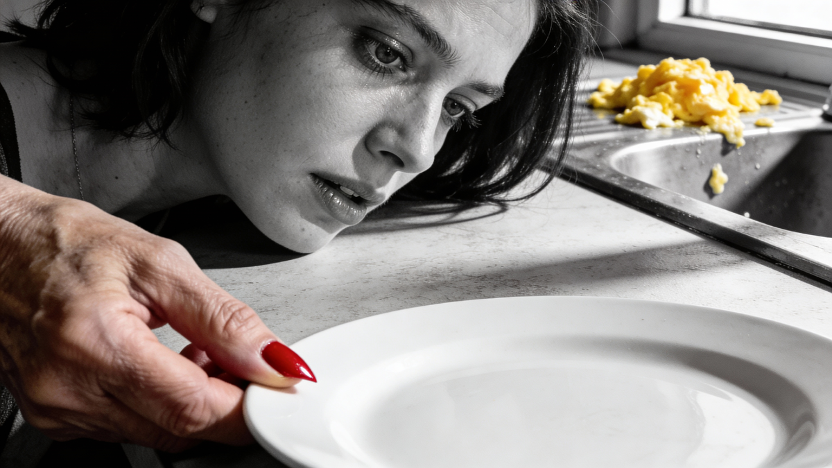 Она не закричала. Она подошла к столу. Взяла тарелку. Её движения были отточенными, почти церемониальными. Она отнесла тарелку к мойке. Опрокинула. Содержимое с глухим шлёпком упало в ведро.