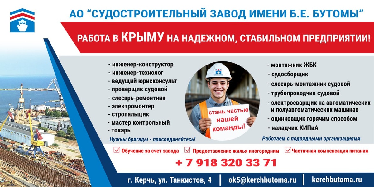 Е. БУТОМЫ» Работа в Крыму на старейшем, надежном и стабильном предприятии судостроительной отрасли! Мы строим будущее и создаем надежные рабочие места. Приглашаем в нашу команду ответственных и целеустремленных специалистов. 🔧 ОСНОВНЫЕ ПРОИЗВОДСТВЕННЫЕ РАБОЧИЕ: • Монтажник конструкций (3-4 разряд) — от 55 000 руб. • Сборщик корпусов металлических судов (4-5 разряд) — от 100 000 руб. • Сборщик-достройщик судовой (4-5 разряд) — от 100 000 руб. • Слесарь-монтажник судовой (5 разряд) — от 100 000 руб. • Токарь — от 60 000 руб. • Трубопроводчик судовой (5 разряд) — от 100 000 руб. • Электросварщик (4-5 разряд) — от 100 000 руб. • Штукатур (3 разряд) — от 50 000 руб. 🛠 ВСПОМОГАТЕЛЬНЫЕ РАБОЧИЕ: • Грузчик — от 32 000 руб. • Подсобный рабочий — от 36 000 руб. • Слесарь-ремонтник (5-6 разряд) — от 52 000 руб. • Стропальщик (5-6 разряд) — от 55 000 руб. • Машинист крана (6 разряд) — от 55 000 руб. • Наладчик сварочного оборудования (5-6 разряд) — от 55 000 руб. • Наладчик КИПиА (5-6 разряд)