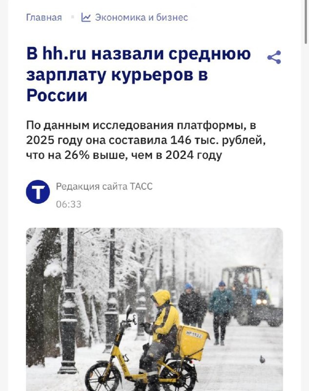 📦 Зарплата курьеров в России взлетела на 26% за 2025 год — до 146 тыс