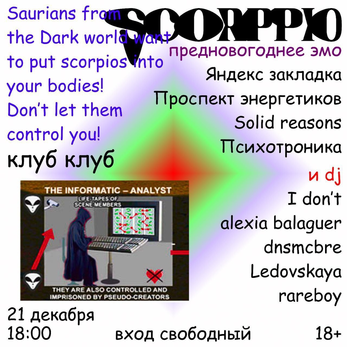 #electronic #emo #postpunk #psychedelic #shoegaze ► Scorppio ● TG ● VK Двойной мега-гиг в симметричную предновогоднюю дату, возможность вернуть миру накопившиеся за год ЭМОции и полирнуть всё под диджейскую мультижанр шабашку. Участники: ► Яндекс закладка ● TG ● VK ► Психотроника ● TG ● VK ► Проспект энергетиков ● TG ● VK ► Solid Reasons ● TG ● VK ► I don't ● TG ► Alexia Balaguer ● TG ► Dnsmcbre ► Ledovskaya ● TG ► Rareboy Бесплатно