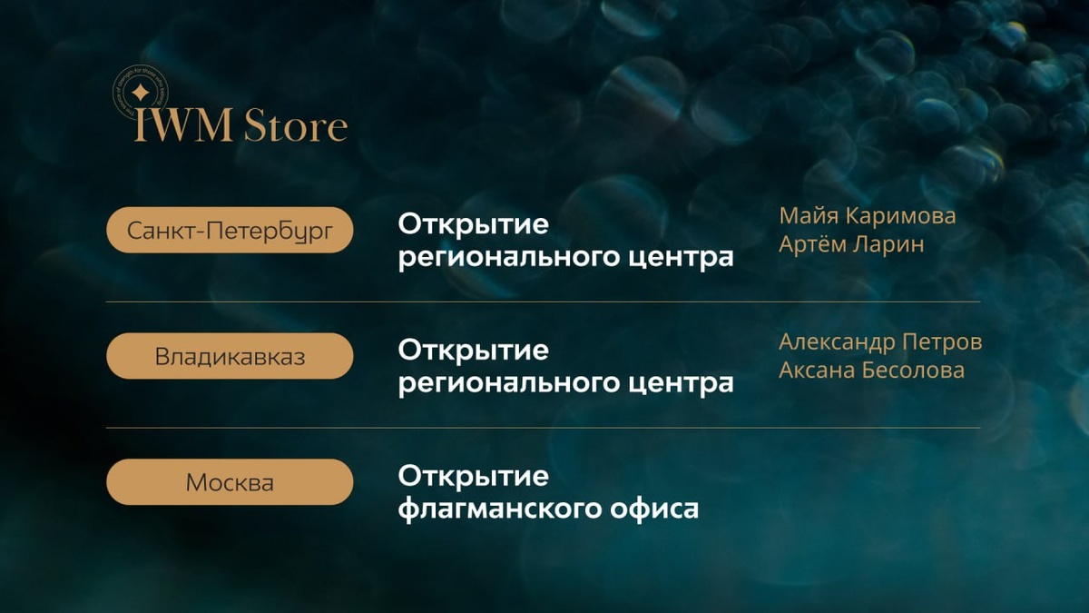 ! Мы расширяемся — и хотим встречать вас не только онлайн, но и в реальном пространстве: с чашкой кофе, содержательной беседой и возможностью задать вопрос глаза в глаза. 📍 Москва | 19 или 20 декабря, флагманский офис (Волхонка, 5/6, стр. 4) 📍 Санкт-Петербург | 20 декабря, 11:30, пространство «Rubicon» 📍 Владикавказ | 18–20 декабря, кулуарные встречи и презентация в NOMADS На всех мероприятиях: ✅ Живая презентация — без «воды», только суть ✅ Возможность пообщаться с лидерами и спикерами напрямую ✅ Фуршет, атмосферные фото, подарки в заказах ✅ Анонсы будущих проектов — первыми узнаете именно вы Регистрация обязательна: 🔹 В Москве 👉 forms.gle/pScvSDqKAkFSTUrf6 🔹 В СПб и Владикавказе — запись к организаторам: → @AnjaNatalija (СПб) → @AksanaB777 / @Emma0477 (Владикавказ) ❗️ Количество мест ограничено. ❗️ Без предварительной записи — вход невозможен. Это ваш шанс увидеть IWM Store изнутри — в компании тех, кто уже строит будущее вместе с нами. Записывайтесь сегодня — завтра ме