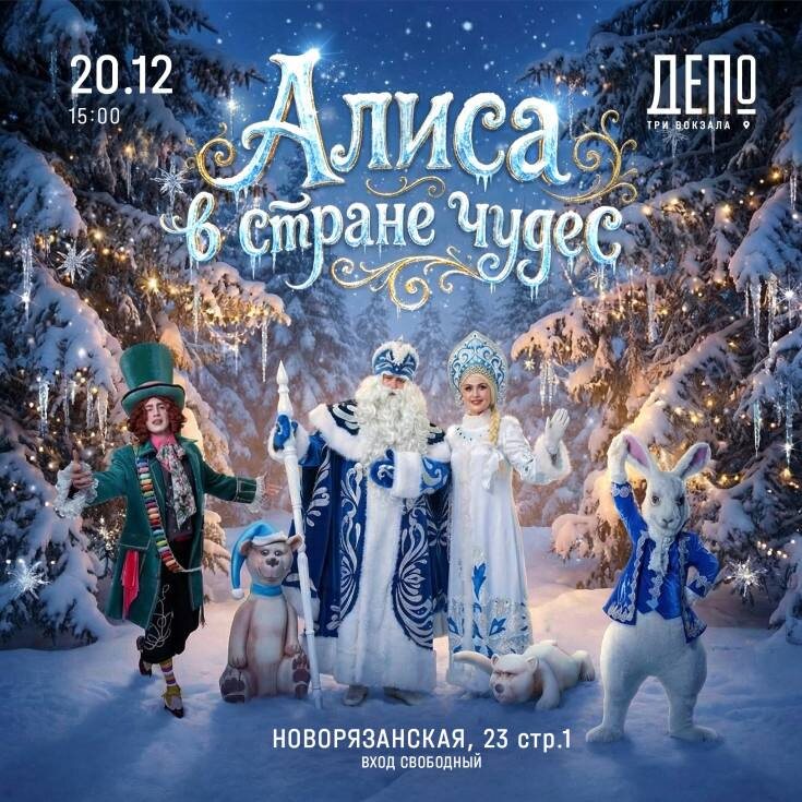 📆 20 и 21 декабря с 12:00 до 21:00 📍 Депо Три вокзала 🎫 Вход свободный 20 декабря с 15:00 на главной сцене ждет представление «Алиса в стране чудес». Вы увидите Белого Кролика — вечно спешащего и подглядывающего на карманные часы, чтобы не опоздать на новогодний бал. Не обойдётся и без безумного любителя чаепитий — Шляпника, который развеселит и научит пить чай по причудливым правилам. А 20 и 21 декабря с 12:00 до 21:00 на площадке пройдёт выставка‑перформанс и дизайн‑маркет «Алиса в стране дизайна», где искусство встретится с повседневностью, а вымысел воплотится в реальность. Гостей ждет иммерсивное путешествие по мотивам любимой сказки. Будем гулять по удивительным площадкам, рассматривая предметы интерьера и декора. Пройдем сквозь таинственный зеркальный лабиринт Посетим локации с необычными работами и предметами современного искусства Заглянем в гостиную с шахматной доской. Интересно, будет ли в этом году в Депо раздача подарков как в прошлом году 🤔 Надеемся на повтор