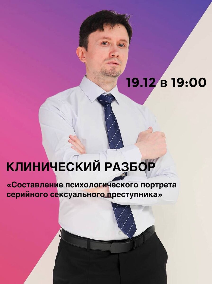 ) 🕰️ В эту пятницу 19.12 в 19:00 Ведущий — Шипицин Дмитрий Юрьевич Юридический психолог, преподаватель криминальной сексологии, медицинский психолог. 🔸Вы узнаете, как формируется психологический портрет серийного сексуального преступника 🔸Поймете, какие клинические признаки и паттерны поведения являются ключевыми 🔸Вы получите практическое понимание работы эксперта с реальным клиническим материалом инструменты профессиональной практики Стоимость: 1800₽ Присоединиться можно по ссылке: https://unisexrnso.ru/klinicheskie-razbory/