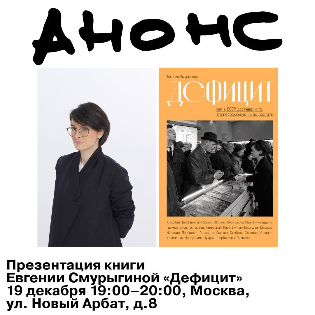 Как в СССР доставали то, что невозможно было достать». (Здравствуйте, я Лена, я книгоголик). Но пост не о книге (о ней я расскажу по прочтении), а о встрече с автором этой самой книги - Евгенией Смурыгиной. Я уже несколько раз была на таких мероприятиях и это всегда очень интересно и атмосферно. Можно просто послушать, если еще не читали - Евгения расскажет о работе над книгой. Можно задать вопросы. Мероприятие совершенно бесплатное. Требуется только предварительная регистрация. Встреча пройдет в "Московском доме книги" на Новом Арбате. Из аннотации к книге: "В книге собраны трепетные воспоминания и истории знаменитых актёров и режиссёров о том, как жили в эпоху тотального дефицита 70-х и 80-х годов, как любили, радовались и с азартом «добывали» желаемое." Когда: 19 декабря 19:00–20:00 Где: Москва, ул. Новый Арбат, д.8 «Московский дом книги» Регистрация на таймпед по ссылке #книги #ссср #москва