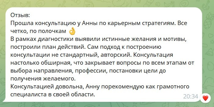 ) Я так редко вспоминаю про них, но они есть Вообще-то, я еще тот "результатник", а итоговый результат моей работы, что в подборе, что в консультациях настолько отсрочен, что только отзывы и остаются. Спасибо за доверие! Напишите, найду 2 окна на консультации в этом году для тех, кто готов действовать, просто поболтать уже нет времени. Средняя зп моих клиентов 350 тыс руб с новыми офферами. Кому нужно повысить зарплату?