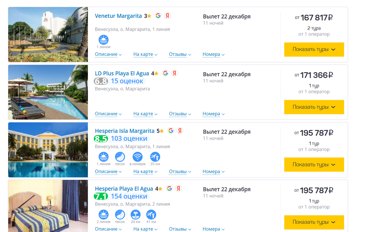уже почти нет. Вылет 22 декабря, обратно 3 января, перелет авиакомпанией Конвиаса из Москвы. После того, как Пегас снял полетную программу в Венесуэлу, предварительно до марта, я, честно говоря предполагал, что то же самое сделают туроператоры ФанСан и Венетур (венесуэльский). Увы, ошибся, хотя в любой момент могут и отменить, в связи очередными заявления Трампа, "благодаря" которым, цены на путевки на о. Маргарита (Венесуэла) прилично упали в цене. И так, что предлагает ФанСан, отели на олл инклюзиве, от 167 т.р. на двоих на 11 ночей. с захватом Нового года Кстати, всего семь отелей в ассортименте, вот "остаток" Билеты уже под запрос и скорее всего на момент выхода публикации их не останется. У Венетура выбор больше и ценник ниже. за 154 т.р. на двоих отель 3* на завтраках, и почти 162 т.р на олл инклюзиве, дешевле на 5 т.р., чем у Фан Сана Пятерки идут от 188 т.р. на двоих по тем же параметрам Не забываем, что это новогодние даты и ценник был в два раза выше, если бы покупали полго