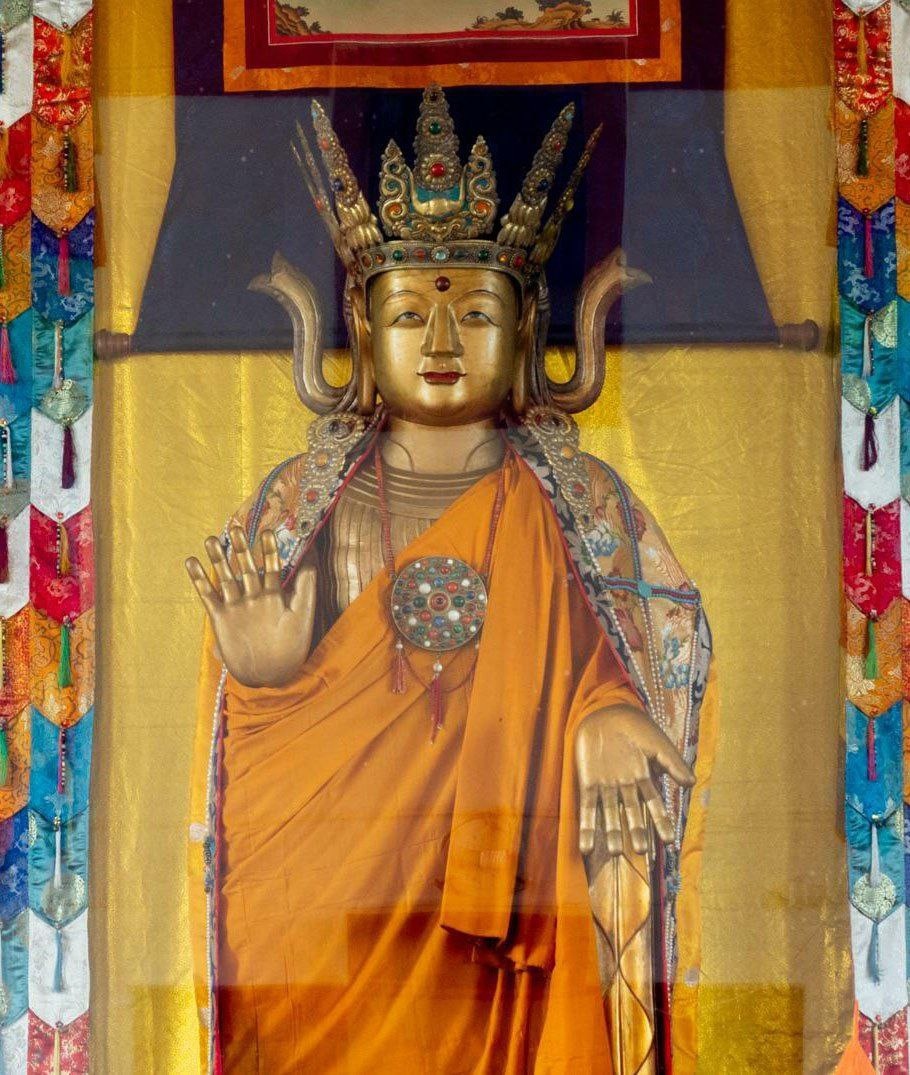 Согласно сутрам, первая статуя Будды была создана во время одного из летних затворничеств, когда Будда внезапно исчез. Обнаружив, что Благословенного нигде нет, ученики начали расспрашивать всех вокруг, но никто не знал, куда пропал Будда. Тогда ученики сходили к Ананде, но и Ананда пребывал в неведении. Он предложил попросить помощи у Анируддхи, который был выдающимся ясновидцем. Силой своего ясновидения Анируддха обнаружил, что Будда отправился на небо Тридцати Трех богов (санскр.: Траястримша) проповедовать Дхарму своей усопшей матери. Почему же Будда ушел на небеса, не предупредив никого? На то были три причины. Во-первых, Будда всегда хотел дать наставления по Дхарме своей матери в благодарность за то, что она дала ему родиться в этом мире. Во-вторых, поскольку Будда постоянно находился со своими учениками, некоторые из них потеряли бдительность и стали невосприимчивы к его учениям. В-третьих, в то время внутри Сангхи начались раздоры, и Будда пожелал дать тем, кто был в них вовле