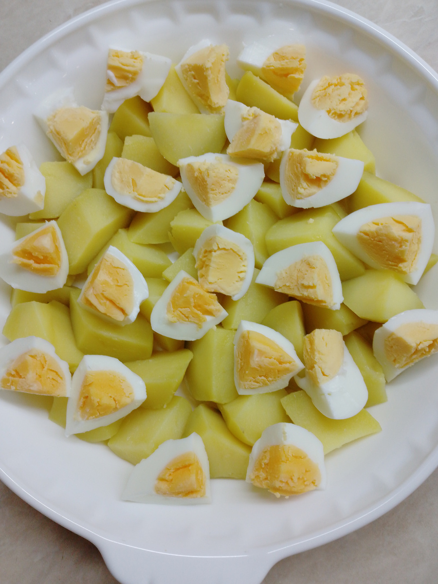 Отварной картофель и сваренные в крутую яйца режем произвольно.