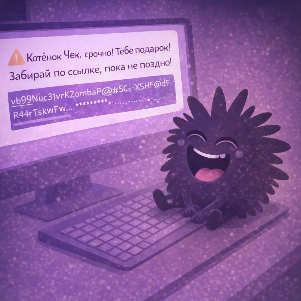 “Срочно… пока не поздно… подарок…” — слова были как липучка: цеплялись и торопили. С другого края экрана будто шевельнулась тёмная тень. Лохматик — хитрый и лохматый — словно прятался за ссылкой и ждал, когда Чек нажмёт. Чек сделал то, чему его учили: не нажимать одному.