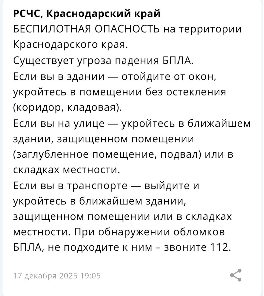 UPD: На территории Краснодарского края объявили отмену угрозы «Беспилотная опасность».