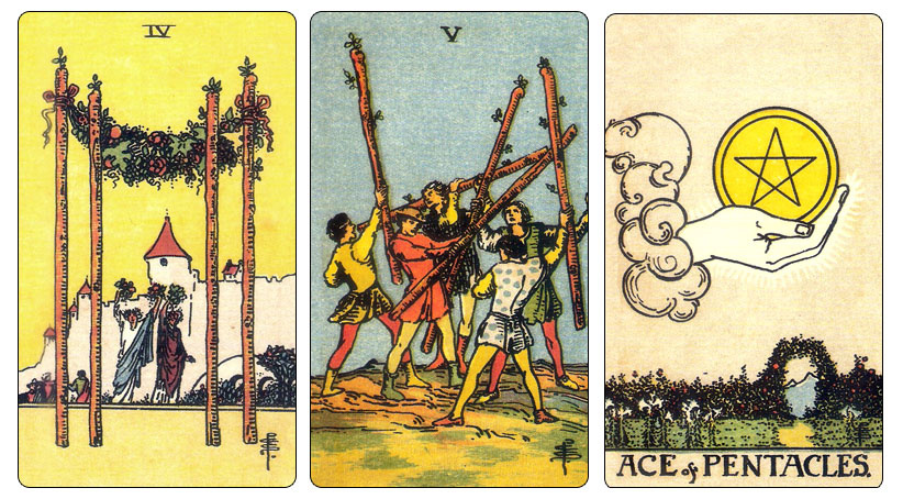 Пятерка Жезлов ничего хорошего не предвещает. Нет, это не потери, не крах и не боль, но это буквально палки в колеса: склоки, разногласия, препятствия, раздрай и разброд. Вот посмотрим сейчас, как этот аркан проигрывается в раскладах в сочетании с другими картами. Вот, предположим, такой расклад и сочетание карт: Четверка Жезлов, Пятерка Жезлов и Туз Монет (Пентаклей). И вопрос: «Как будут дела обстоять на работе?». Хорошо будут обстоять. Мирно, стабильно, и вполне удовлетворительно в ближайшее время (Четверка Жезлов). Потом будет какая-то склока, споры, разногласия (Пятерка Жезлов). Это может с коллегой быть склока. Или долго не получается согласовать с заказчиком проект, то одно, то другое. Но в итоге по Тузу Монет согласуем (если с заказчиком) на солидную сумму. Или в целом, зарплату поднимут, сделки закроем. Или же пока не прибавят денег, но предложат повышение в открывающимся через три месяца филиале. Не прям сейчас, но в перспективе.По Тузу Монет денег явно должно стать больше и