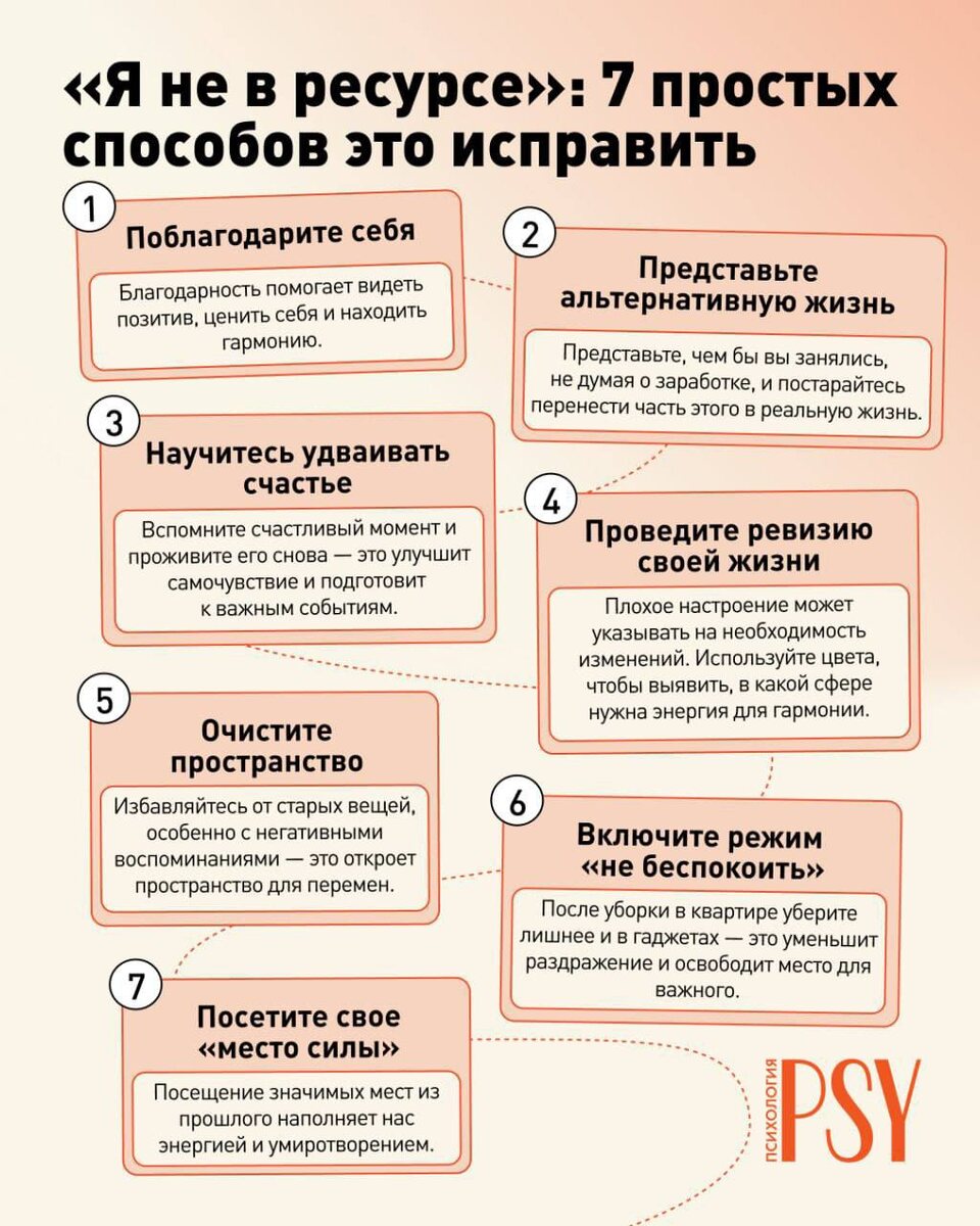 ️⃣ ✅ «Я не в ресурсе»: 7 простых способов это исправить Фраза «Я не в ресурсе» стала мемом, но за ней скрывается реальная проблема — нехватка энергии, мотивации и сил даже на простые дела. Когда ресурс на нуле, хочется только залипать в сериалы и ленту соцсетей. Но хорошая новость — восполнить свой энергетический заряд проще, чем кажется! Делимся 7 рабочими способами, которые помогут перезагрузить внутреннюю батарейку и вернуть силы.⤴️ #советы @Пинский Вестник 📱Ютуб 📱ВК 📱ИНСТАГРАМ 📱ОК 📱ФЕЙСБУК 📱ТИК ТОК Прислать новость