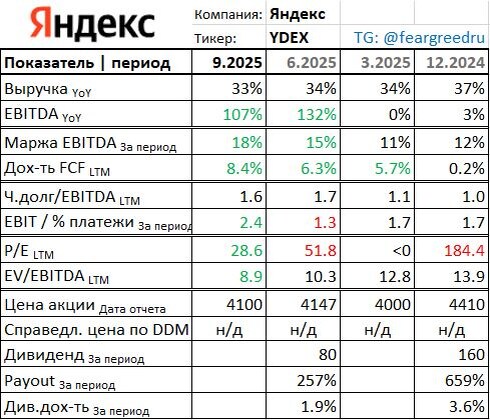 Яндекс - отчетность 9 мес 2025 Это будет самый короткий пост про отчетность - все хорошо (см.табличку). Главное - держат рост в это непростое время. P.S. с постепенной нормализацией расходов на программу мотивации, нормализуется и прибыль и P/E. В моем портфеле доля Яндекса 11%. @feargreed
