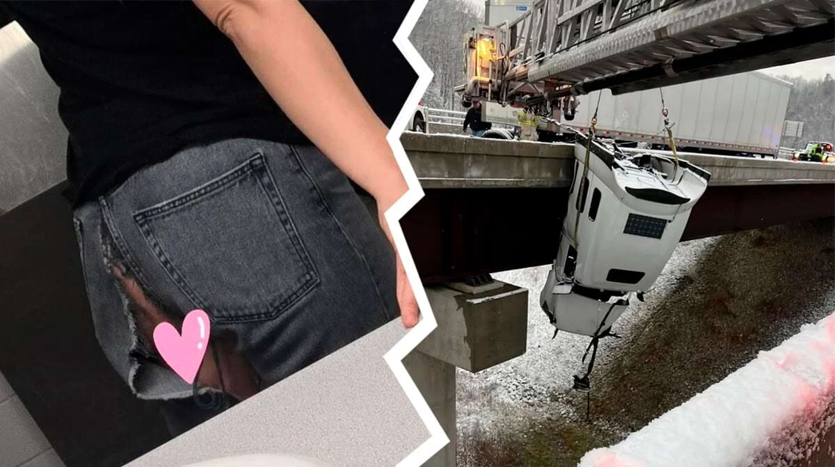 Этот случай произошел в США, где, как сообщается, водитель грузовика не справился с управлением из-за сильного снегопада. В результате аварии он повис в кабине на мосте на высоте 30 метров 😱