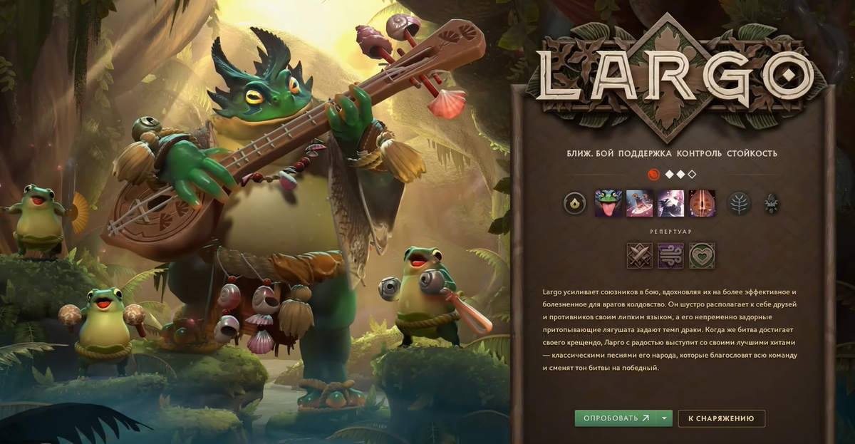 Новый год еще не наступил, а Valve уже радуют нас кучей обновлений. И одно из самых важных из них - это добавление нового героя. И вот перед нами Largo - лягушка-квакушка с гитарой за спиной. Кто же он такой и что умеет? Давайте разбираться. Судя по описанию герой самый настоящий саппорт. Кидает баффы на союзников и принимает урон от противников. Первая его способность очень напоминает хук Пуджа. Ларго своим длинным языком притягивает к себе врага или союзника. Но не полностью и не очень далеко. Дополнительно применяет развеивание и наносит урон (если это враг). При развеивании способностей у Ларго увеличивается восстановление здоровья. Вторая способность взята была у Алхимика. Ларго кидает пруд с лягушатами, которые замедляют врагов в нем и наносят периодический урон. Третья способность это бафф союзника. При выборе своего тиммейта у него будет меньше расходоваться мана на заклинания, а наносимый урон отдаваться эхом в течение 5 секунд! Выглядит очень полезно и приятно. И наконец
