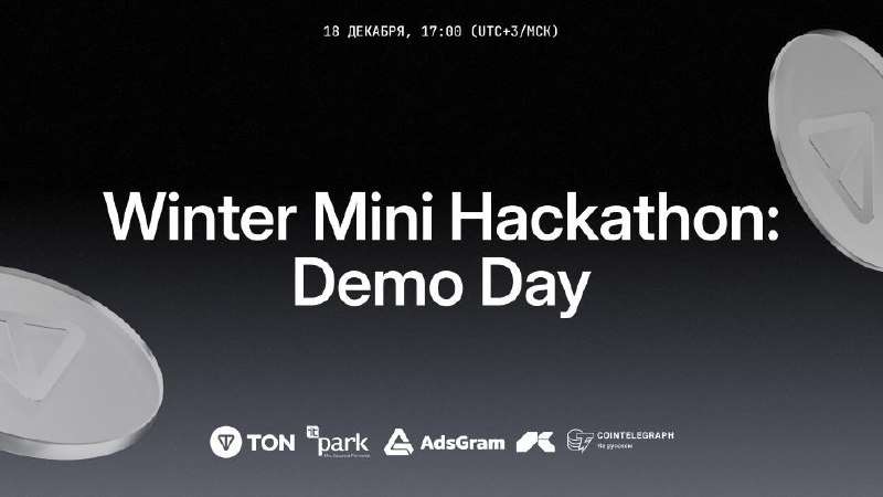 ! Завтра подводим итоги Winter Mini Hackathon, который проходит при поддержке наших партнёров: IT Park Kazan, Криптополигон, AdsGram и Cointelegraph CIS и слушаем питчи проектов, которые команды собирали последние две недели. Это финальная точка хакатона: 3 минуты на презентацию, 2 минуты на вопросы от экспертов и фидбек, который поможет докрутить продукт дальше. Эксперты Demo Day: ▪️Анастасия Югова — TON CIS Hub Lead ▪️Михаил — Head of BD Cointelegraph CIS ▪️Елизавета Быданова — Senior Business Development Manager, AdsGram ▪️Вадим Стерлин — Co-founder AdsGram ▪️Султан Абзалов — Product Owner в Upscale / Storm Trade ▪️Игорь Заплетнев — Founder CapsGame Встречаемся завтра в 17:00 (UTC+3/МСК) в Telegram, VK, X, а также на YouTube или Twitch. ➡️Добавь событие в Google-календарь До встречи завтра на Demo Day — приходите поддержать команды и забрать максимум пользы из фидбека! 🚀 Новости | Чат | Форум билдеров | YouTube | Teletype | Twitter | VK | Twitch