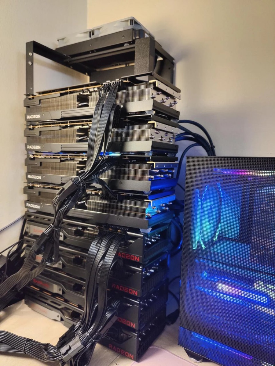 Автор собрал систему на 8 видеокартах AMD Radeon 7900 XTX, получил 192 ГБ видеопамяти, добавил 192 ГБ оперативки и поставил Intel Core i7 14700F на плате Z790, а кучу видеокарт прикрутил через PCIe switch карту с AliExpress примерно за 500 долларов, чтобы на обычной материнке это вообще завелось. Всё крутится на Windows 11 через Vulkan в LM Studio и Open WebUI, а общая цена сборки примерно 6 или 7к$. Потребление 1Квт. Скорость генерации около 200 токенов в секунду на модели GLM4.5Air q6. Зачем? Например, у вас в компании ну очень важные данные и вы не доверяете облакам. Делаете такую сборку, ставите в ДЦ и создаете контент со скоростью 500 символов русского языка в секунду. Русский ИТ бизнес