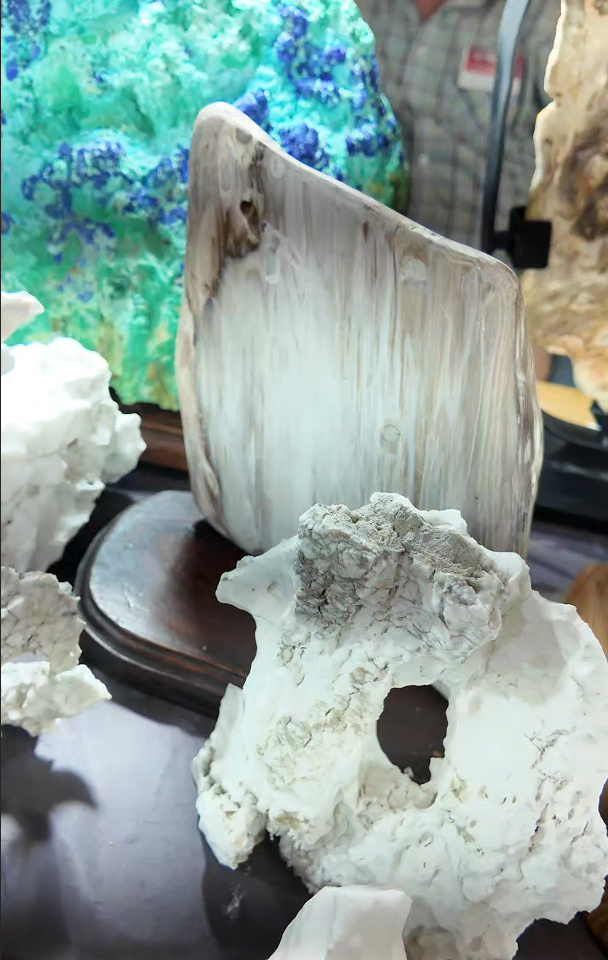На выставке «Гемма» моё внимание привлекла необычная палатка: рядом соседствовали спилы окаменелого дерева и белые камни, словно обветренные и подтаявшие, как весенний снег. Давайте рассмотрим эти образцы внимательнее.