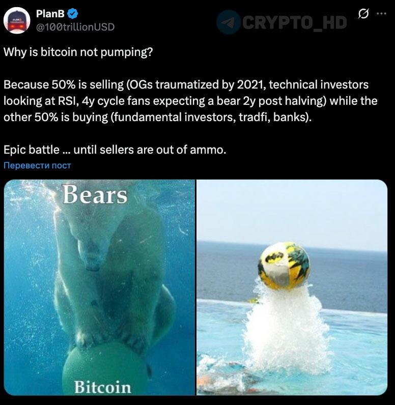 ? ➤ 50% продают BTC – олды (OG), травмированные 2021-м годом, технические инвесторы, смотрящие на RSI, фанаты 4-летнего цикла, ожидающие медвежьего рынка через 2 года после халвинга. ➤ 50% покупают BTC – фундаментальные инвесторы, TradFi, банки и другие. Эпическая битва...пока у продавцов не закончатся патроны. Cryptо Headlines