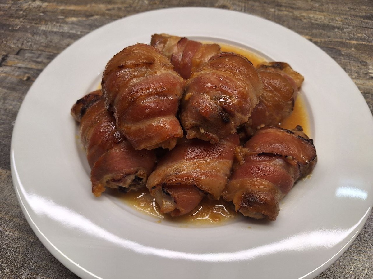 Этот рецепт — настоящий пример того, как из простых и доступных продуктов можно приготовить блюдо, которое выглядит празднично и вызывает искренний интерес у гостей. Куриные рулетики с черносливом в беконе я готовлю в те моменты, когда хочется порадовать семью чем-то особенным, но без долгого стояния у плиты и сложных кулинарных техник. Такие рулетики одинаково хорошо подойдут и для уютного домашнего ужина, и для праздничного стола — они всегда выглядят аккуратно и очень эффектно. Начинаю с подготовки курицы. Если бёдра попались на кости, аккуратно вырезаю её острым ножом, стараясь не порвать мясо. Каждый кусок слегка отбиваю через пищевую плёнку. Важно не переусердствовать: нам не нужна тонкая лепёшка, достаточно выровнять толщину, чтобы рулетик потом сворачивался равномерно. Уже на этом этапе советую слегка подсушить мясо бумажными полотенцами — так специи и соус будут держаться лучше. Подготовленные бёдра солю и немного перчу с обеих сторон. При желании можно добавить щепоть сушёно